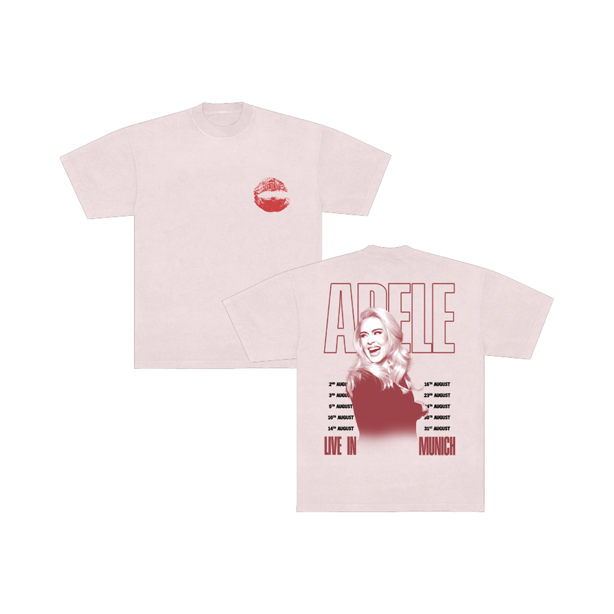 Pink short sleeve tee with Lips printed on the front and a photo of Adele with event dates on the back. 100% cotton, unisex fit.