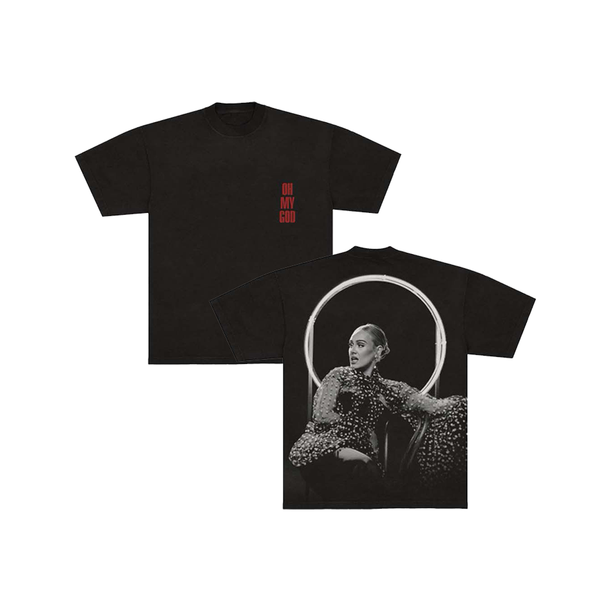 Black short sleeve tee with 'OH MY GOD' printed on the front and Adele photo printed on the back. 100% cotton, unisex fit.