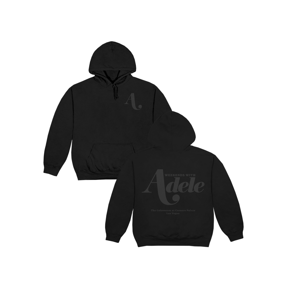 Black pullover hoodie with 'A' printed on front left chest and 'Weekends with Adele' printed on the back.